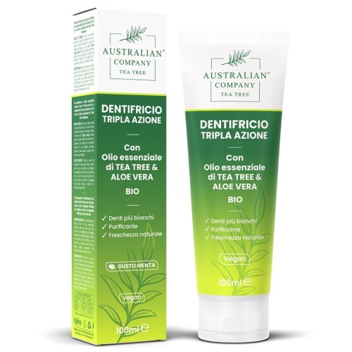 DescrizioneDentifricio tripla azione con olio essenziale di tea tree e aloe vera biologica.