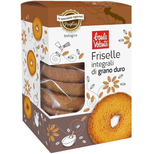 Le friselle sono piccole ciambelle di pane che, dopo una prima cottura in forno, vengono tagliate in due orizzontalmente e fatte biscottare: una lavorazione alla quale devono la loro forma irregolare. Lievitato con pasta madre.