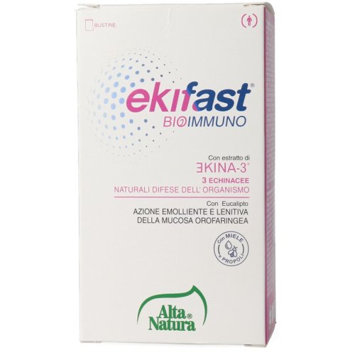 Ekifast con la sinergia tra Salice, China e Centaurea è utile per la regolarità del processo di sudorazione, importante durante gli stati febbrili ed influenzali. Le tre specie di Echinacea utili alla funzionalità delle prime vie respiratorie coadiuvano le naturali difese dell'organismo insieme all' Astragalo, alla Tabebuia e all'Uncaria. L'estratto di Eucalipto dona un effetto balsamico utile per il tono della voce ed un'azione emolliente e lenitiva sulla mucosa orofaringea, contribuendo al benessere di naso e gola. Con Rosa Canina per un'azione di sostegno e ricostituente, e semi di Pompelmo dalle proprietà antiossidanti. Arricchito con Miele e Propoli.