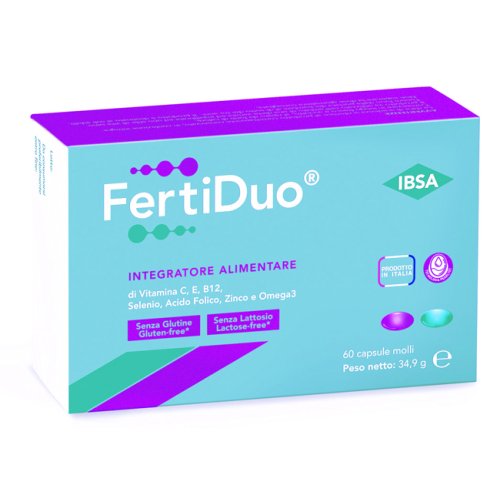 - FertiDuo GIORNO: olio di pesce ricco in omega 3, gelatina alimentare, vitamina C (acido L-ascorbico), vitamina E (D- alfa-tocoferolo) in olio di girasole, agente di resistenza: glicerolo (E422); glutatione, addensante: mono- e digliceridi degli acidi grassi (E471); vitamina B12 0,1% (cianocobalamina) su maltodestrine da mais, L-seleniometionina, coloranti: biossido di titanio (E171), ossido di ferro (E172).