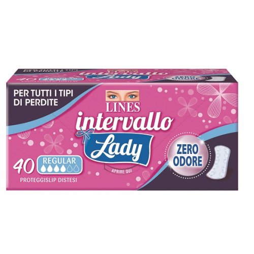 La gamma di proteggislip Lines Intervallo Lady è studiata per garantire una protezione da tutti i tipi di perdite che richiedono extra assorbenza. Assicura discrezione nell'indossarlo, grazie al cuore superassorbente che garantisce l'asciutto, non rinunciando al comfort. In più offre una maggior discrezione grazie al sistema controlla odori "Anti Odour System" ad azione potenziata. L'esclusiva tecnologia altamente traspirante ed il filtrante ipoallergenico, studiato per ridurre il rischio di allergie, garantiscono il rispetto del naturale equilibrio della pelle. Le barriere laterali, decorate e femminili, assicurano un contatto morbido con la pelle.