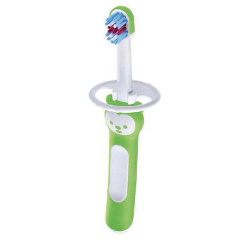 Con anello di sicurezza per mantenere lo spazzolino a distanza di sicurezza dal fondo della bocca del bambino.