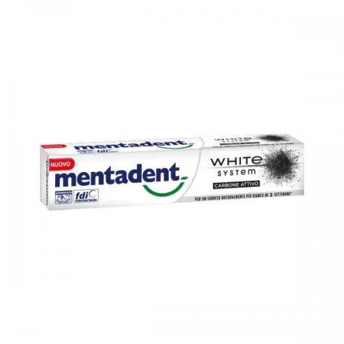 DescrizioneLa formula del nuovo dentifricio Mentadent White Carbone Attivo aggiunge ad un minerale sbiancante naturale la polvere di carbone attivo, per una rimozione delle macchie superficiali dello smalto efficace ed un sorriso naturalmente più bianco.