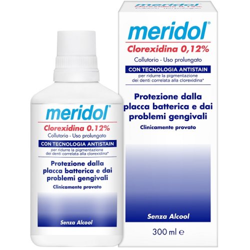 Collutorio meridol Clorexidina 0,12% con clorexidina digluconato ed esclusiva tecnologia Antistain capace di creare uno scudo sui denti tale da respingere i pigmenti alimentari.