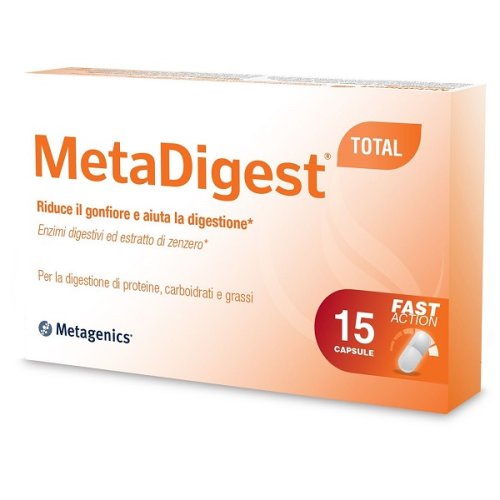 Integratore di enzimi per favorire la digestione di proteine, carboidrati e grassi. MetaDigest Total è un integratore a base di enzimi digestivi di origine non animale e quindi adatto anche a consumatori vegetariani o vegani. Esso contiene una miscela bilanciata di enzimi per la digestione delle proteine, dei grassi e dei carboidrati normalmente presenti in un pasto completo. La presenza di lecitina aiuta ad emulsionare i grassi e la presenza di fitasi favorisce la degradazione dei fitati presenti in una dieta ricca di vegetali che possono contrastare l'assorbimento di alcuni micronutienti. Gli enzimi di MetaDigest total funzionano indipendentemente dal pH e quindi già nello stomaco. La formulazione di MetaDigest total contiene anche estratto secco di zenzero in grado di supportare la funzione digestiva.
