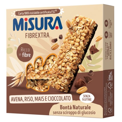 Selezione Fibrextra Misura 52% (fiocchi di avena integrale senza glutine 23%; fiocchi di riso e mais 17%: riso, crusca di mais, farina di mais, zucchero, sale; fiocchi di mais 7%: mais, zucchero, sale); fibra solubile di cicoria: oligofruttosio 25%; cioccolato 11% (pasta di cacao, zucchero, burro di cacao; emulsionante: lecitina di soia; aroma), cereale croccante 6% (farina di riso, farina di mais, zucchero, sale), olio di girasole.