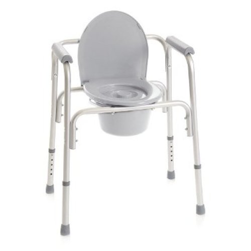 Struttura in tubo di alluminio anodizzato con confortevole seduta in polietilene, secchio e braccioli in plastica e puntali in gomma antiscivolo.Comprende quattro funzioni in una: rialzo per water, supporto per water, sedia comoda e sedile per doccia.