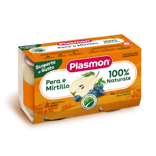 Omogeneizzato pera e mirtillo 100% naturale con aggiunta di vitamina C.