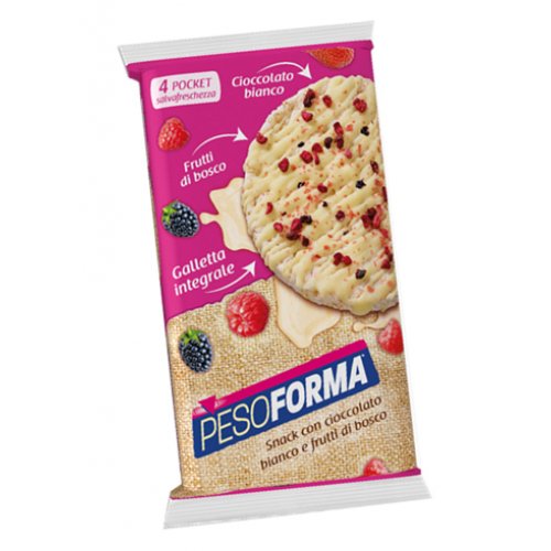 Snack a base di galletta di riso integrale con cioccolato bianco e frutti di bosco, a basso contenuto di sale e il 35% di grassi in meno rispetto alla media degli snack a base cioccolato più venduti.