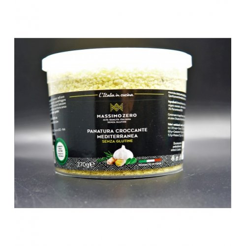 Panatura croccante mediterranea senza glutine, specificamente formulata per persone intolleranti al glutine.