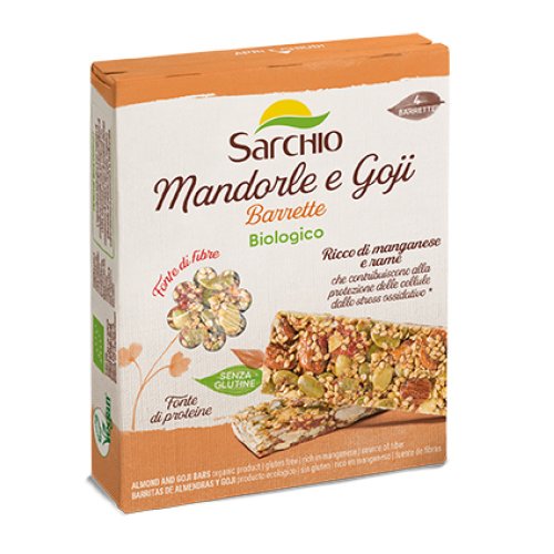 Barrette Mandorle e Goji. Prodotto specificatamente formulato per persone intolleranti al glutine. Fonte di fibre e di proteine. Adatto a vegani.