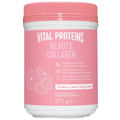 Peptidi di collagene bovino, fragola disidratata (7,5%), inulina, aromi, succo di limone disidratato (2,4%), acqua di cocco disidratata, ialuronato di sodio, biotina.
