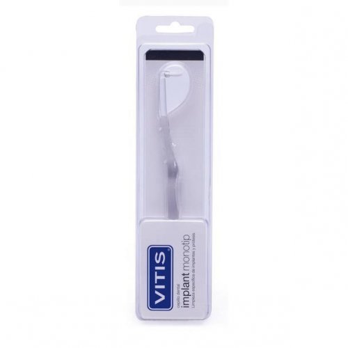 VITIS® Implant Monotip è uno spazzolino con testina di piccole dimensioni. Le setole di Tynex si presentano in un unico ciuffo facilitando l'eliminazione del biofilm orale negli spazi ridotti e proteggendo la cavità buccale. Le sue morbide setole raggruppate permettono una pulizia di massima precisione di protesi, barre, abutment, viti ecc. per una corretta manutenzione.